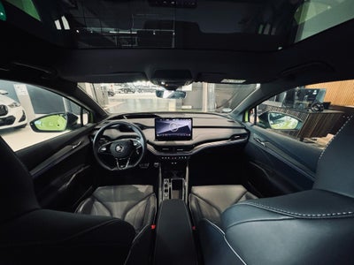 Topudstyret Skoda Enyaq RS Coupé i Mamba Green med både varmepumpe, svingbart træk, Panoramatag samt CANTON hifisysyem!